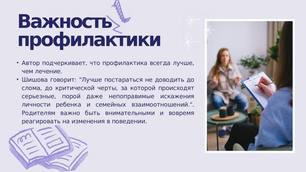 Важность профилактики Автор подчеркивает, что профилактика всегда лучше, чем лечение. Шишова говорит: "Лучше постараться не доводить до слома, до критической черты, за которой происходят серьезные, порой даже непоправимые искажения личности ребенка и семейных взаимоотношений.". Родителям важно быть внимательными и вовремя реагировать на изменения в поведении.