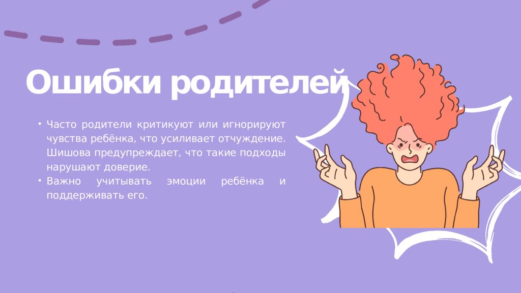 Ошибки родителей Часто родители критикуют или игнорируют чувства ребёнка, что усиливает отчуждение. Шишова предупреждает, что такие подходы нарушают доверие. Важно учитывать эмоции ребёнка и поддерживать его.