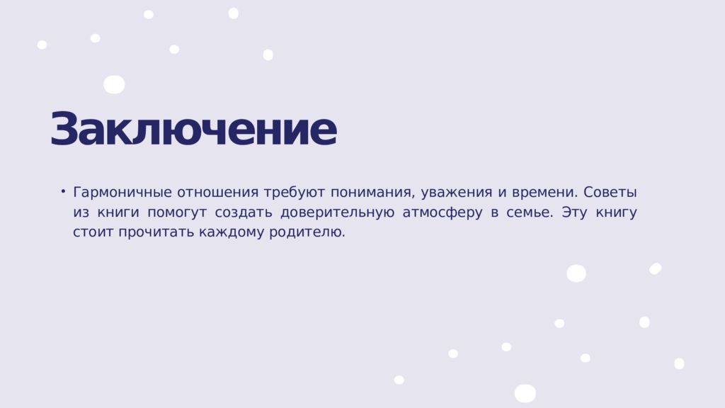 Заключение Гармоничные отношения требуют понимания, уважения и времени. Советы из книги помогут создать доверительную атмосферу в семье. Эту книгу стоит прочитать каждому родителю.