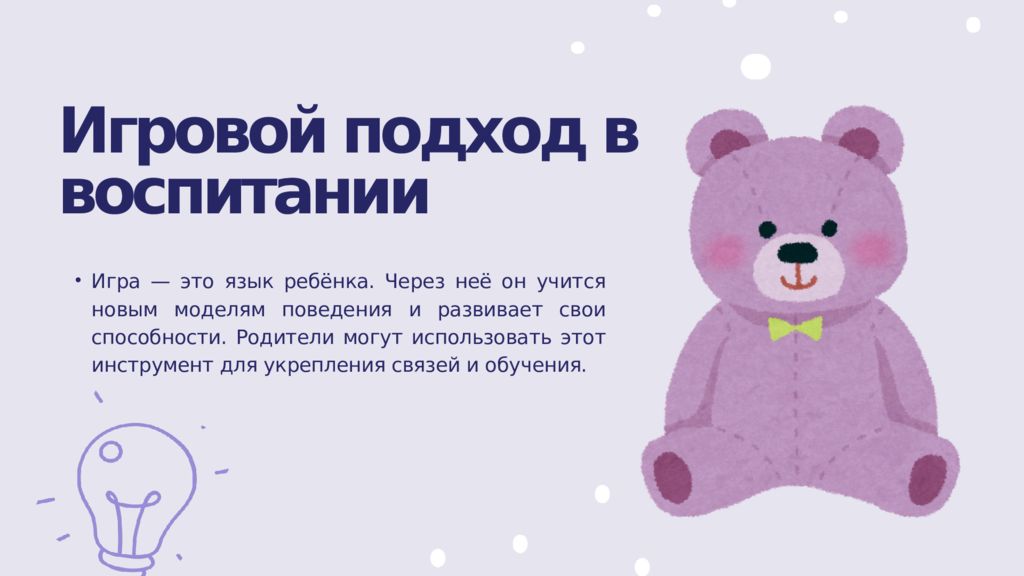 Игровой подход в воспитании Игра — это язык ребёнка. Через неё он учится новым моделям поведения и развивает свои способности. Родители могут использовать этот инструмент для укрепления связей и обучения.