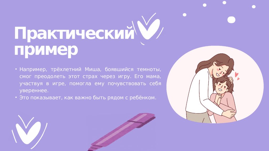Практический пример Например, трёхлетний Миша, боявшийся темноты, смог преодолеть этот страх через игру. Его мама, участвуя в игре, помогла ему почувствовать себя увереннее. Это показывает, как важно быть рядом с ребёнком.