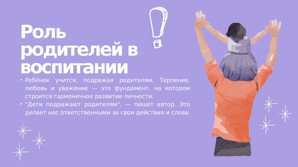 Роль родителей в воспитании Ребёнок учится, подражая родителям. Терпение, любовь и уважение — это фундамент, на котором строится гармоничное развитие личности. "Дети подражают родителям", — пишет автор. Это делает нас ответственными за свои действия и слова.