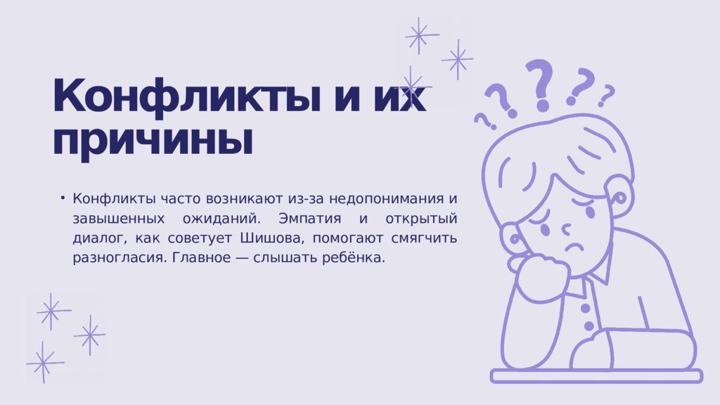 Конфликты и их причины Конфликты часто возникают из-за недопонимания и завышенных ожиданий. Эмпатия и открытый диалог, как советует Шишова, помогают смягчить разногласия. Главное — слышать ребёнка.