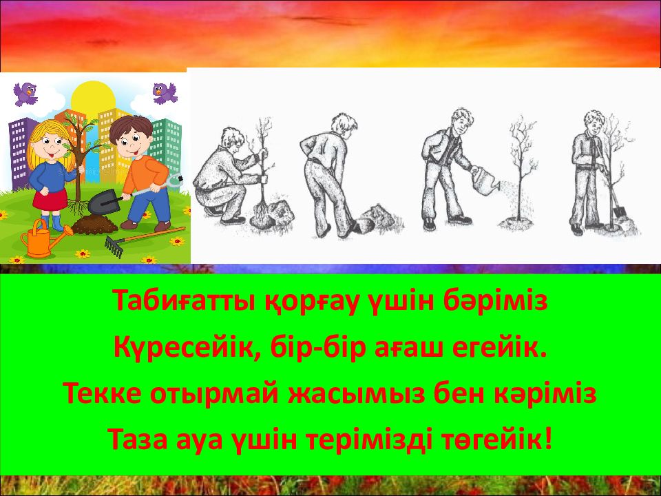 Табиғатты қорғау үшін бәріміз Күресейік, бір-бір ағаш егейік. Текке отырмай жасымыз бен кәріміз Таза ауа үшін терімізді төгейік!