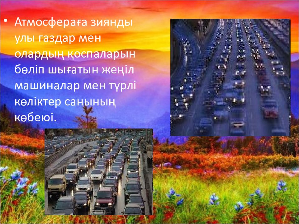 Атмосфераға зиянды улы газдар мен олардың қоспаларын бөліп шығатын жеңіл машиналар мен түрлі көліктер санының көбеюі.