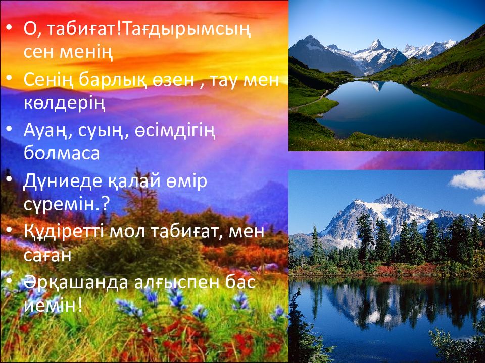О, табиғат!Тағдырымсың сен менің Сенің барлық өзен, тау мен көлдерің Ауаң, суың, өсімдігің болмаса Дүниеде қалай өмір сүремін.? Құдіретті мол табиғат, мен саған Әрқашанда алғыспен бас иемін!