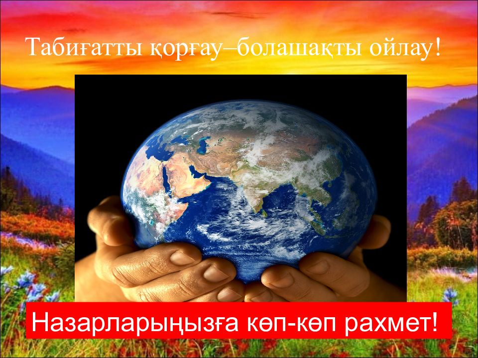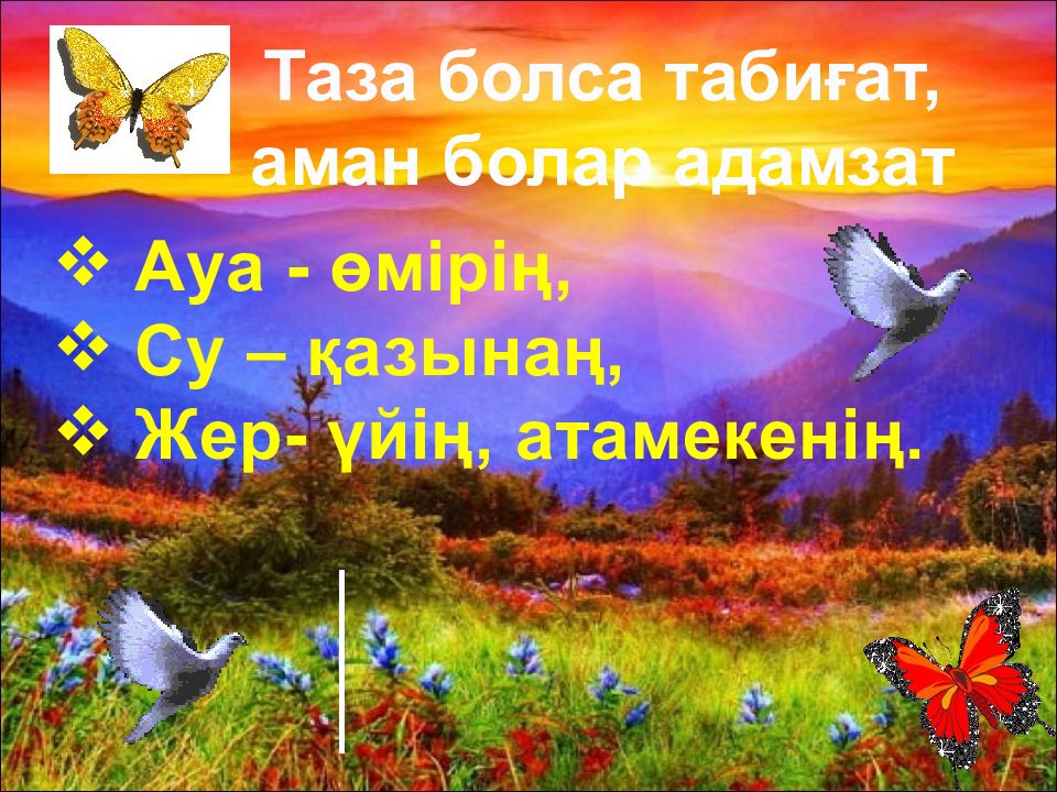 Таза болса табиғат, аман болар адамзат Ауа - өмірің, Су – қазынаң, Жер- үйің, атамекенің.