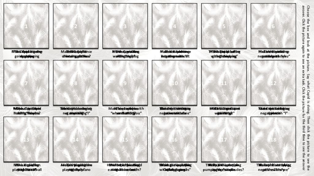 ©tcha4u This Cupid is going shopping 1 Make the sentence negative This Cupid isn’t going shopping This Cupid is holding flowers 7 Make a question with “why” Why is this Cupid holding flowers? This Cupid is playing basketball 13 Make a question with “who” Who is playing basketball? This Cupid is choosing clothes 2 Make the sentence interrogative Is this Cupid choosing clothes? This Cupid is aiming at something 8 Make the sentence negative with “I” I am not aiming at anything This Cupid is playing the piano 14 Make the question with “you” Are you playing the piano? This Cupid is walking the dog 3 Make a question with “they” Are they walking the dog? This Cupid is sunbathing 9 Make a question with “where” and “you” Where are you sunbathing? This Cupid is eating an ice cream 15 Make the question with “how fast” How fast is this Cupid eating an ice cream? This Cupid is listening to music 4 Make the sentence negative with “I” I am not listening to music This Cupid is sitting in a metro car 10 Make the sentence negative with “we” We aren’t sitting in a metro car This Cupid is playing video games 16 Make the question with “what games” What games is this Cupid playing? This Cupid is baking cookies 5 Make the question with “how long” This Cupid isn’t going shopping This Cupid is painting 11 Make the question with “what” What is this Cupid painting? This Cupid is pumping up his muscles 17 Make the question with “why” Why is this Cupid pumping up his muscles? This Cupid is reading a book 6 Make the sentence negative with “you” You aren’t reading a book This Cupid is taking a photo 12 Make the sentence negative with “I” I am not taking a photo This Cupid is studying at the library 18 Make the sentence negative with “we” We aren’t studying at the library Choose the box and look at the picture. Say what Cupid is doing. Then click the picture to see the answer. Click the picture again to see an extra task. Click the picture for the third time to see the answer