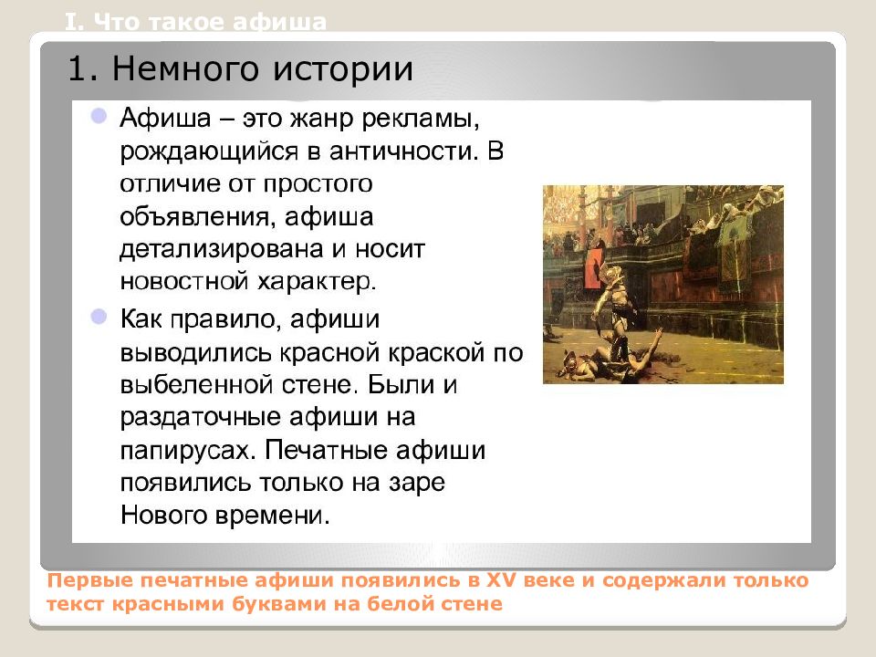 Слайд 2: Первые печатные афиши появились в XV веке и содержали только текст красными буквами на белой стене