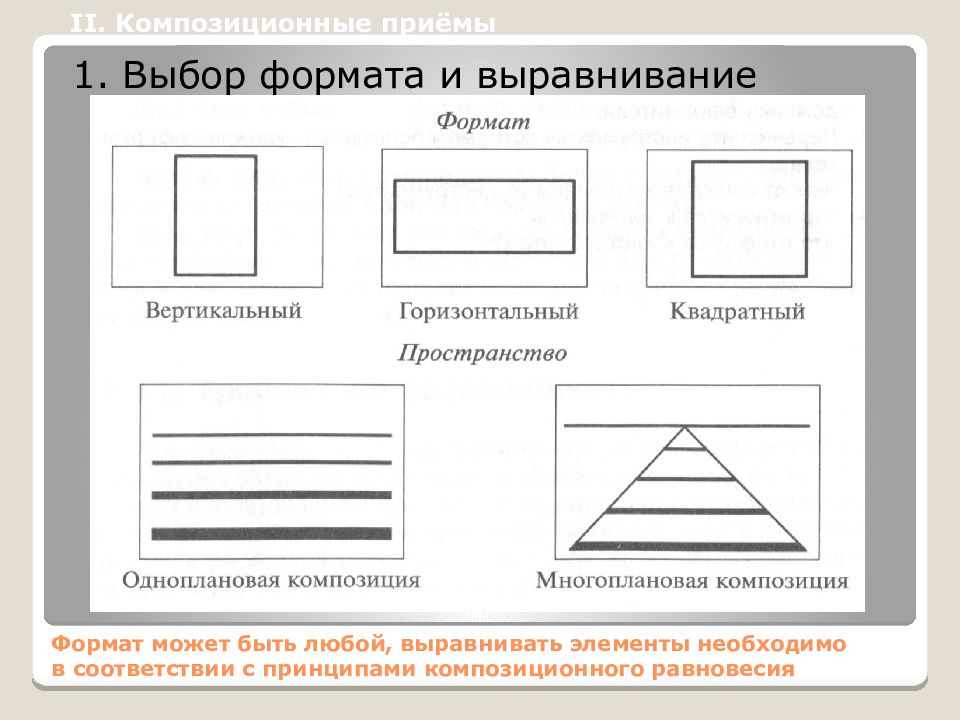 1. Выбор формата и выравнивание II. Композиционные приёмы