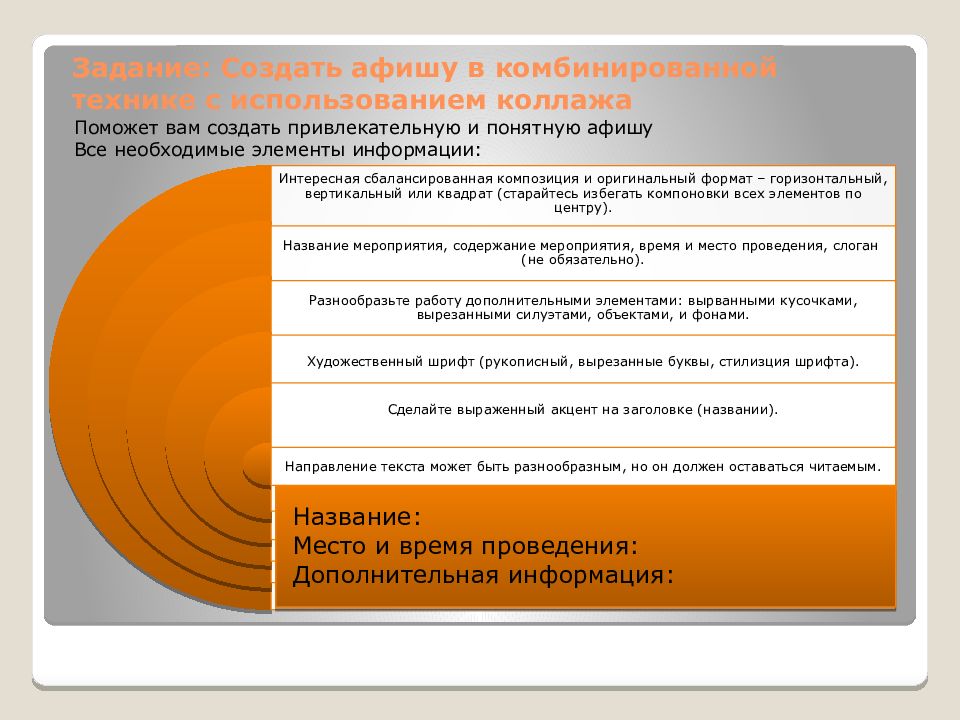 Задание: Создать афишу в комбинированной технике с использованием коллажа Поможет вам создать привлекательную и понятную афишу Все необходимые элементы информации : Название: Место и время проведения: Дополнительная информация: