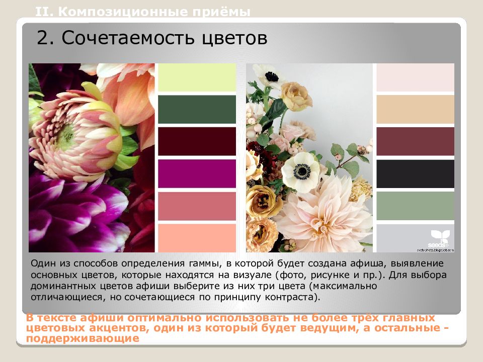 2. Сочетаемость цветов II. Композиционные приёмы Один из способов определения гаммы, в которой будет создана афиша, выявление основных цветов, которые находятся на визуале (фото, рисунке и пр.). Для выбора доминантных цветов афиши выберите из них три цвета (максимально отличающиеся, но сочетающиеся по принципу контраста).