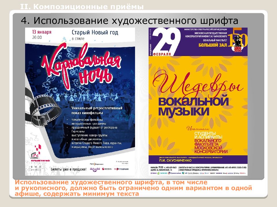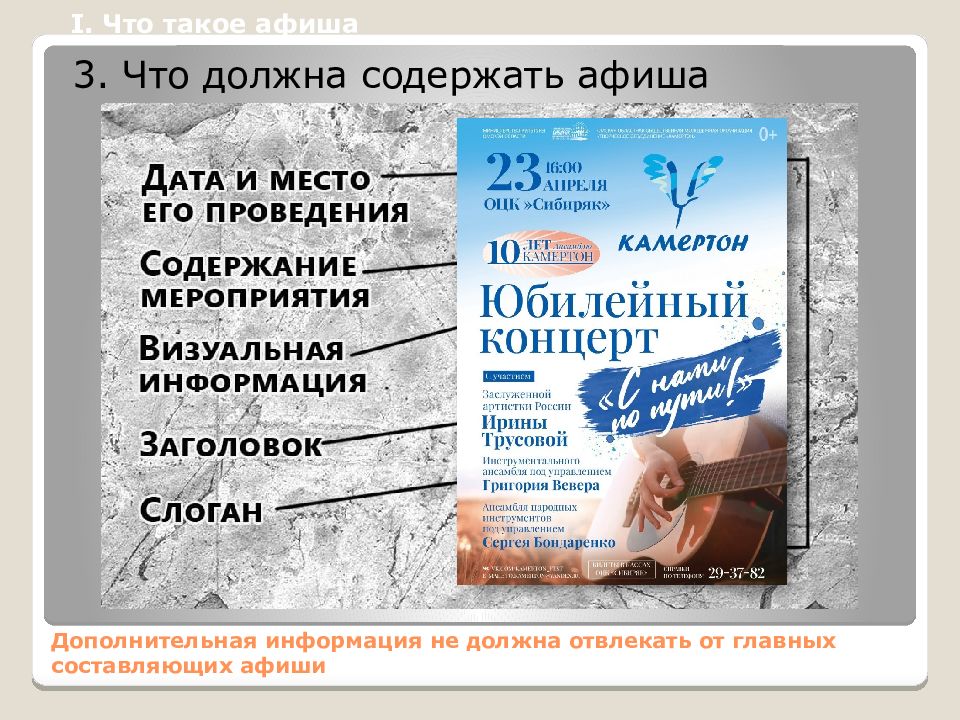Слайд 4: Д ополнительная информация не должна отвлекать от главных составляющих афиши