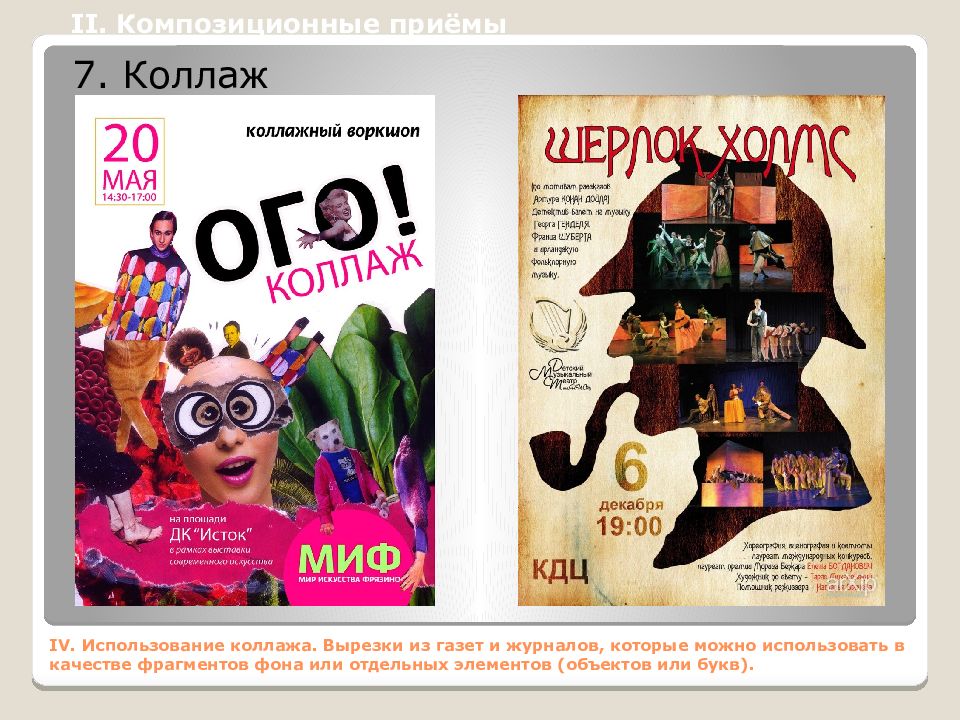 7. Коллаж II. Композиционные приёмы IV. Использование коллажа. Вырезки из газет и жу р налов, которые можно использовать в качестве фрагментов фона или отдельных элементов (объектов или букв ).
