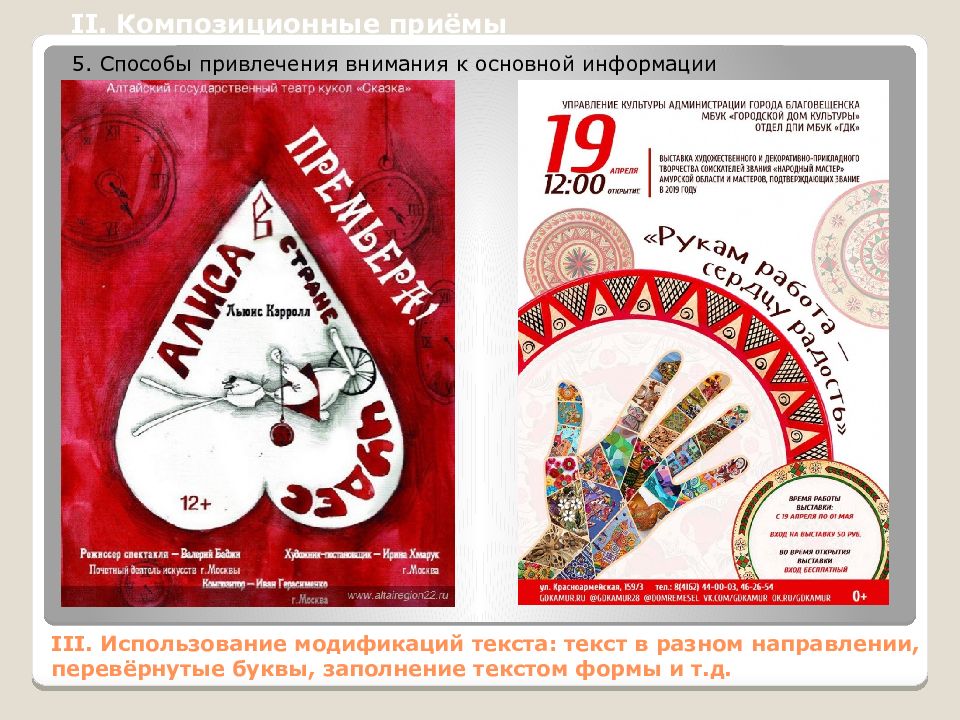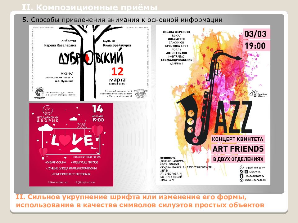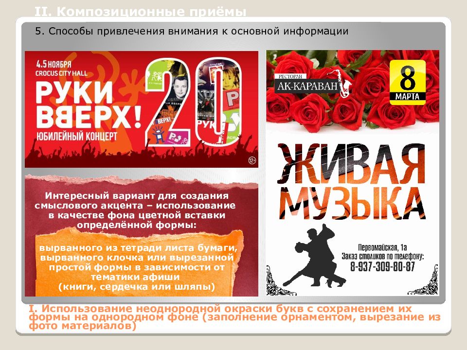 5. Способы привлечения внимания к основной информации II. Композиционные приёмы