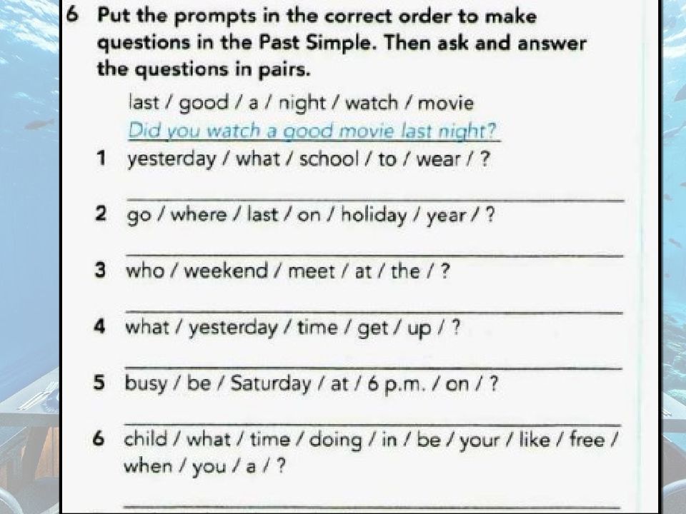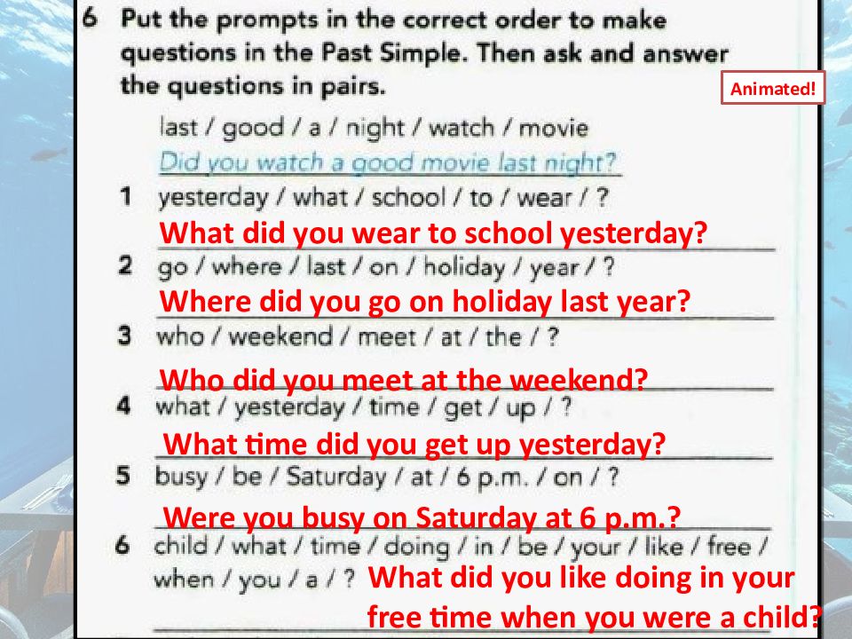 What did you wear to school yesterday? Where did you go on holiday last year? Who did you meet at the weekend? What time did you get up yesterday? Were you busy on Saturday at 6 p.m.? What did you like doing in your free time when you were a child? Animated!