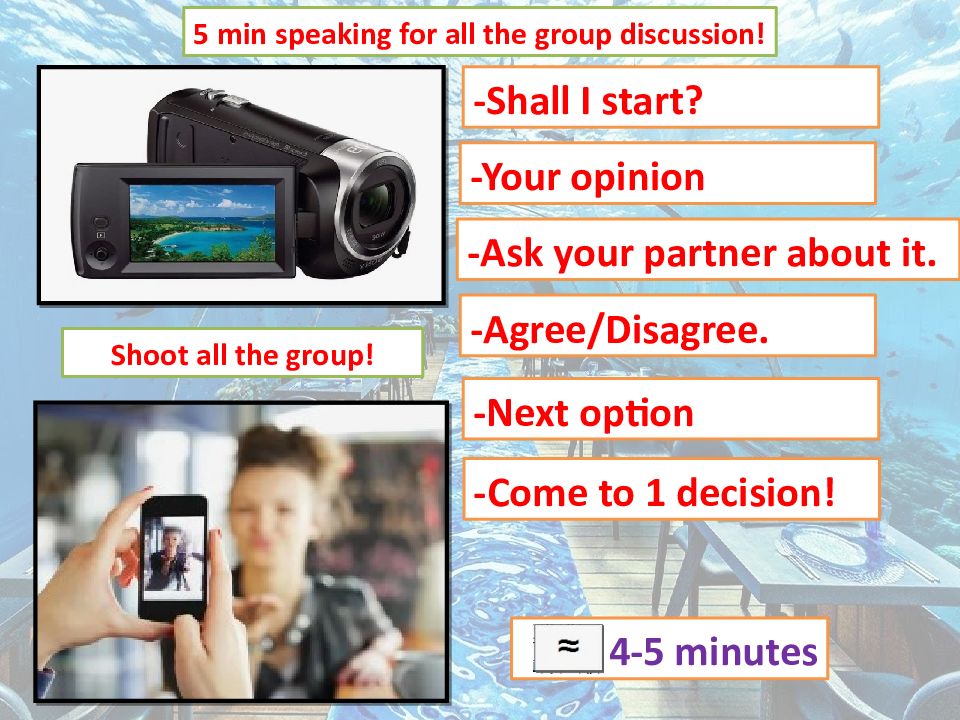 5 min speaking for all the group discussion! -Shall I start? Shoot all the group! -Your opinion -Ask your partner about it. -Agree/Disagree. -Next option -Come to 1 decision! 4-5 minutes