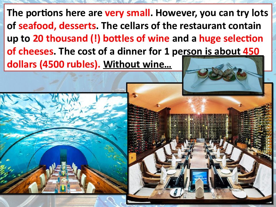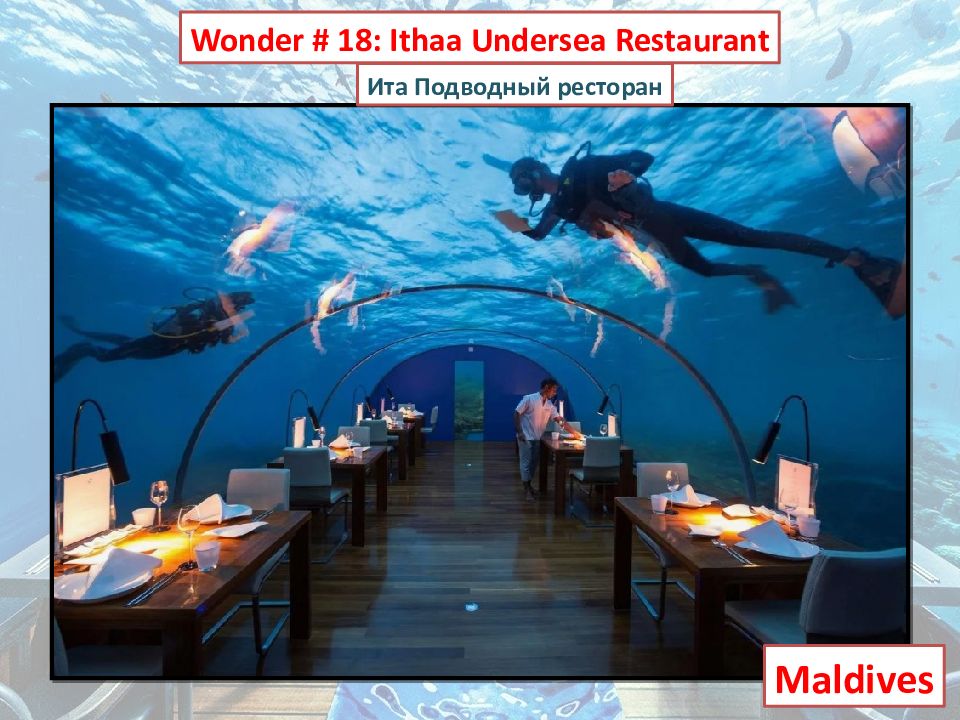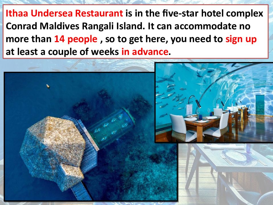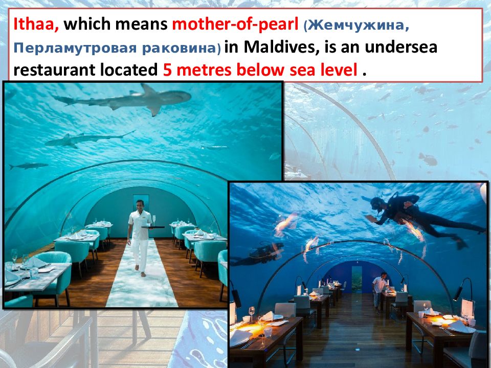 Ithaa, which means mother-of-pearl ( Жемчужина, Перламутровая раковина ) in Maldives, is an undersea restaurant located 5 metres below sea level.