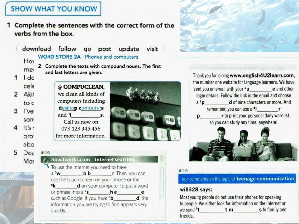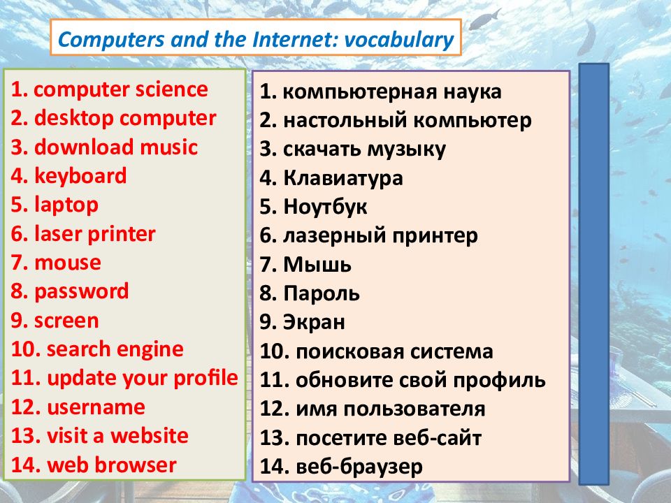 Computers and the Internet: vocabulary computer science 2. desktop computer 3. download music 4. keyboard 5. laptop 6. laser printer 7. mouse 8. password 9. screen 10. search engine 11. update your profile 12. username 13. visit a website 14. web browser компьютерная наука 2. настольный компьютер 3. скачать музыку 4. Клавиатура 5. Ноутбук 6. лазерный принтер 7. Мышь 8. Пароль 9. Экран 10. поисковая система 11. обновите свой профиль 12. имя пользователя 13. посетите веб-сайт 14. веб-браузер