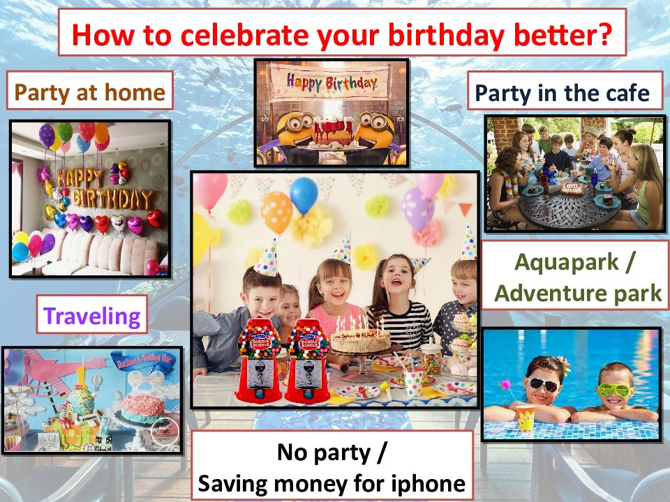 Party at home Party in the cafe Aquapark / Adventure park Traveling No party / Saving money for iphone How to celebrate your birthday better?