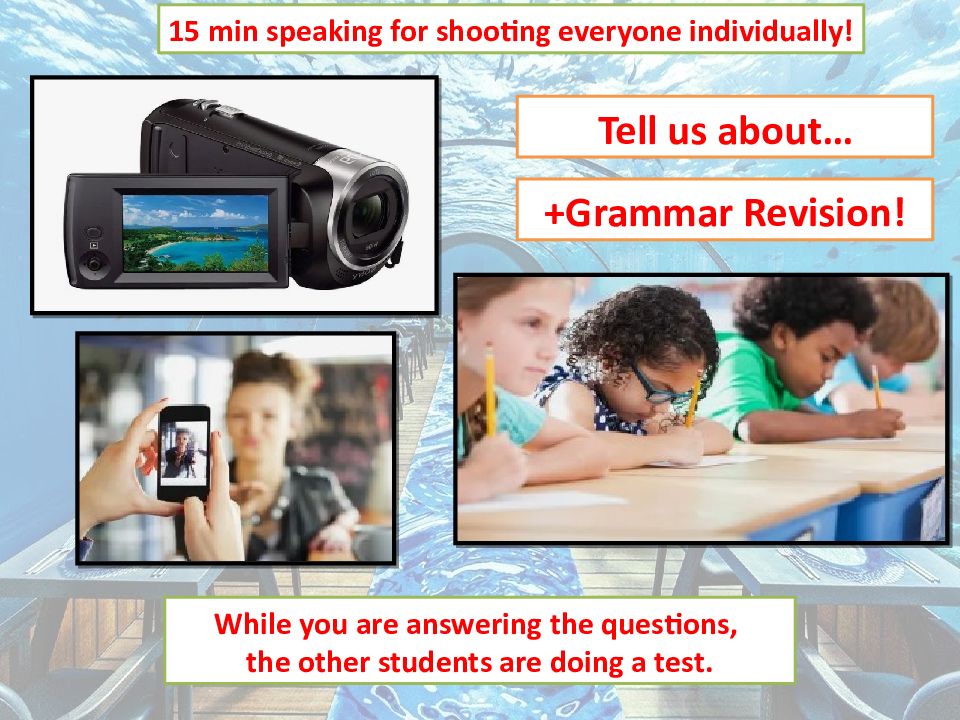 15 min speaking for shooting everyone individually! Tell us about… While you are answering the questions, the other students are doing a test. +Grammar Revision!