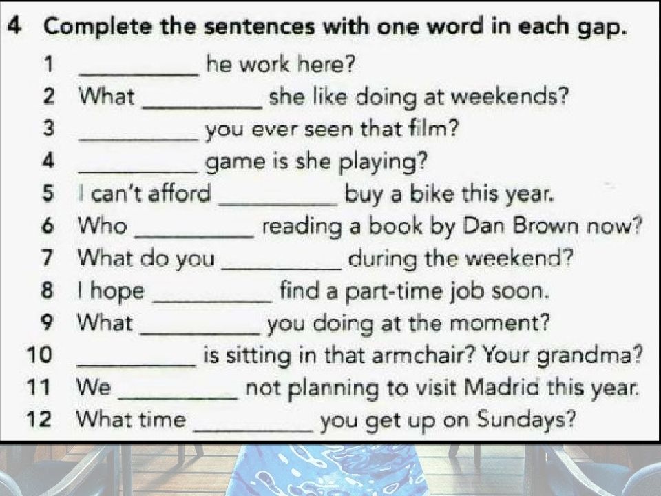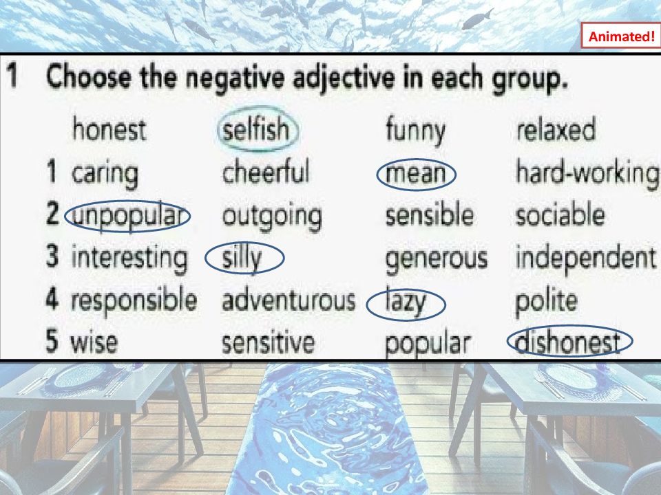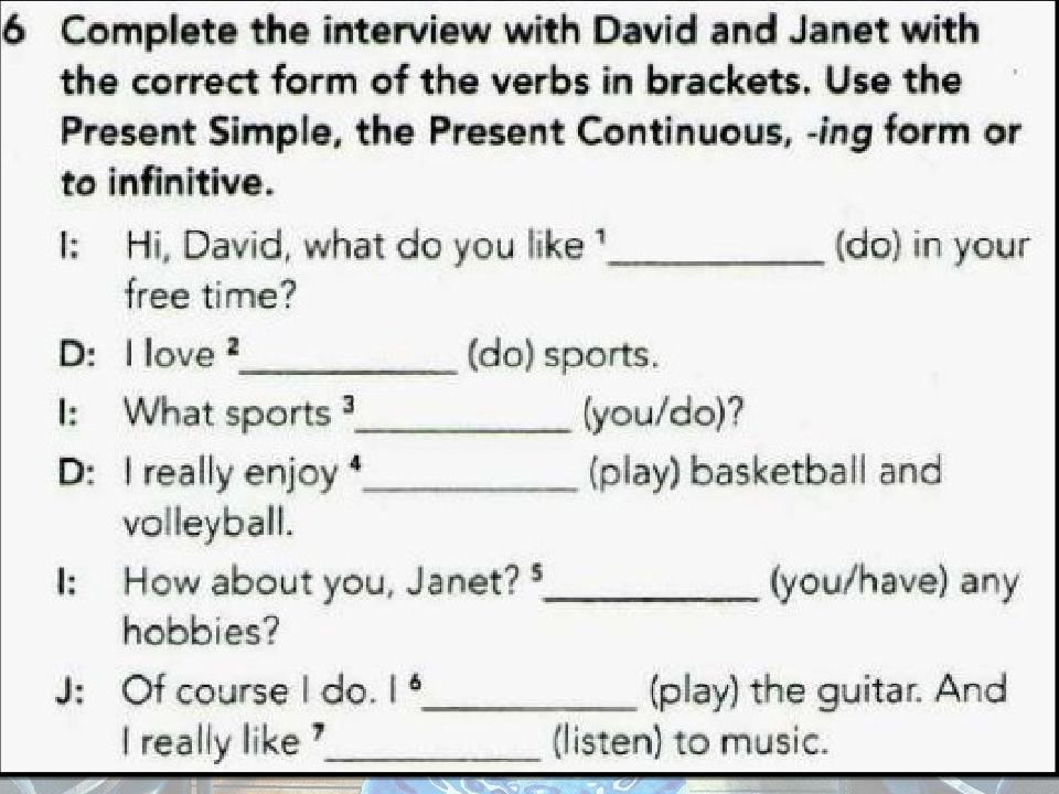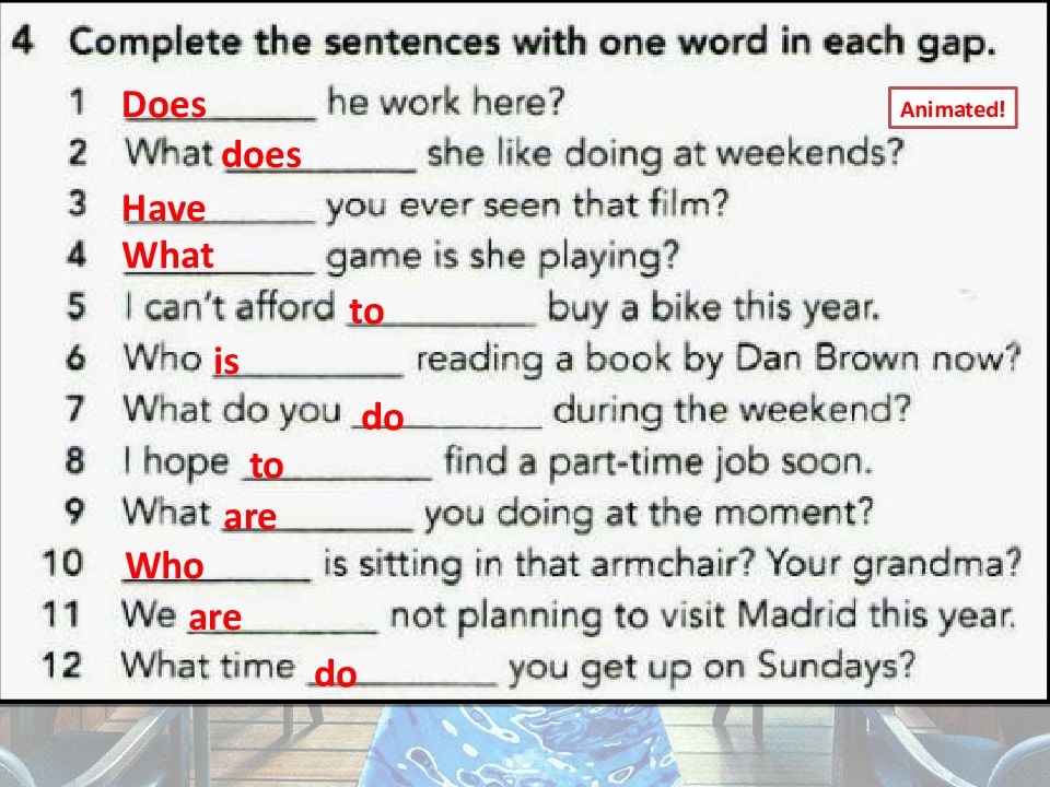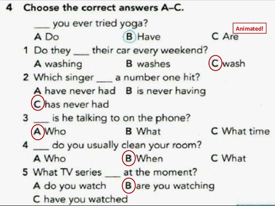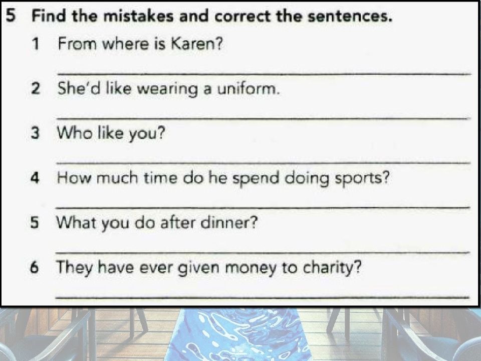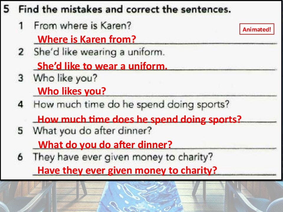 Where is Karen from? She’d like to wear a uniform. Who likes you? How much time does he spend doing sports? What do you do after dinner? Have they ever given money to charity? Animated!