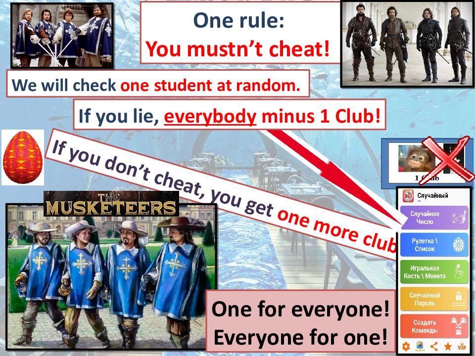We will check one student at random. One rule: You mustn’t cheat! If you don’t cheat, you get one more club! One for everyone! Everyone for one! If you lie, everybody minus 1 Club!