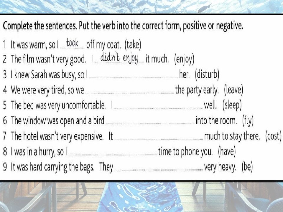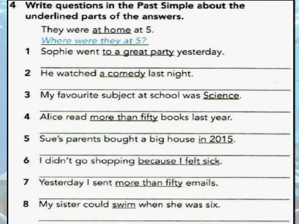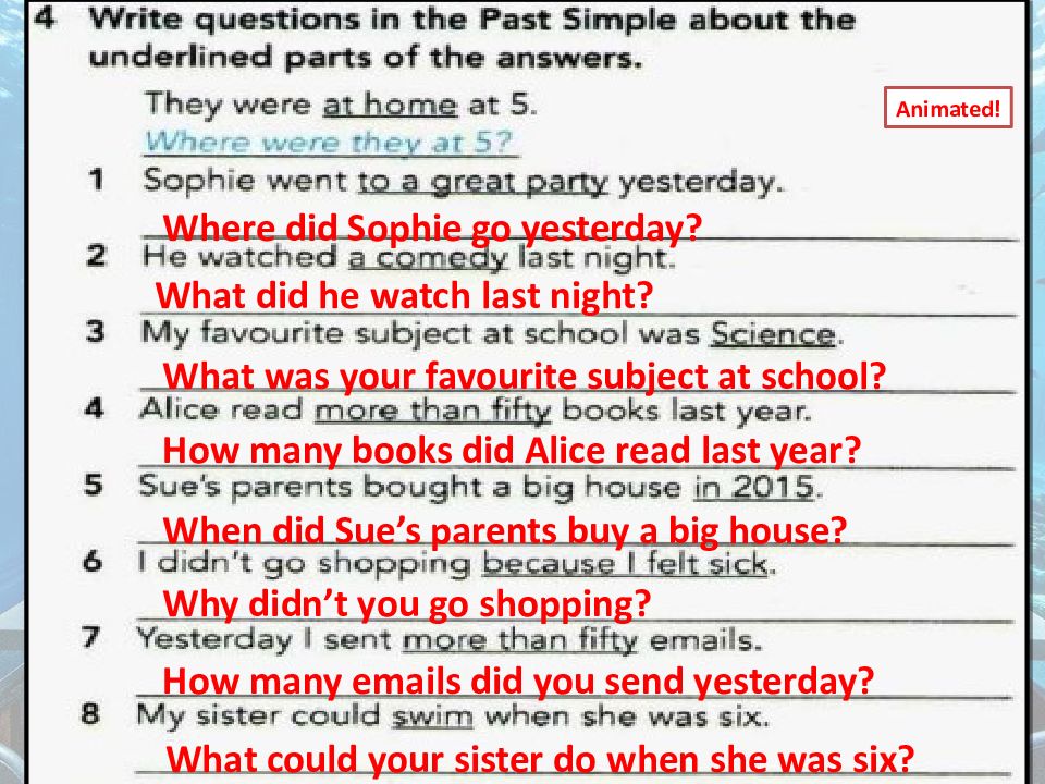 Where did Sophie go yesterday? What did he watch last night ? What was your favourite subject at school? How many books did Alice read last year ? When did Sue’s parents buy a big house ? Why didn’t you go shopping ? How many emails did you send yesterday ? What could your sister do when she was six ? Animated!