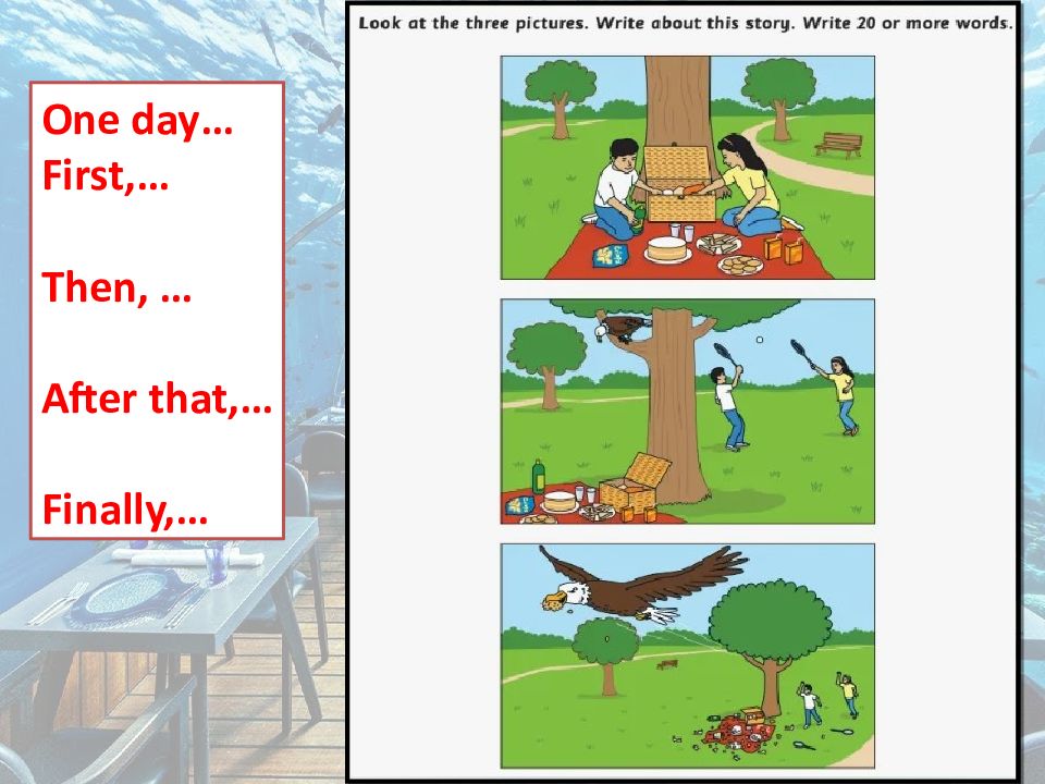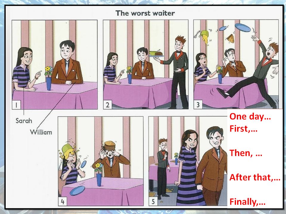 Кто + что делает… (настоящее время) One day… First,… Then, … After that,… Finally,…
