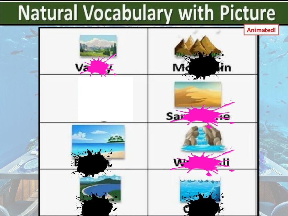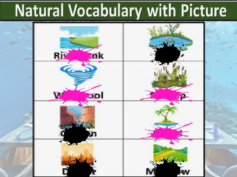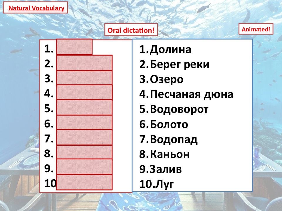 Valley Riverbank Lake Sand d une Whirlpool Swamp Waterfall Canyon Bay M eadow Natural Vocabulary Долина Берег реки Озеро Песчаная дюна Водоворот Болото Водопад Каньон Залив Луг Oral dictation! Animated!