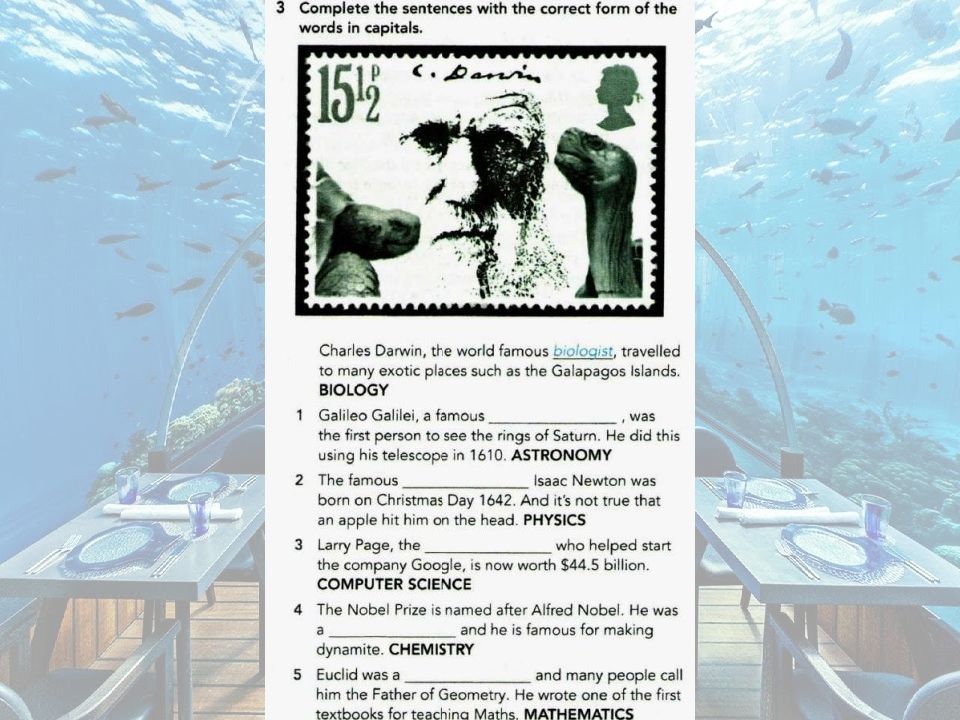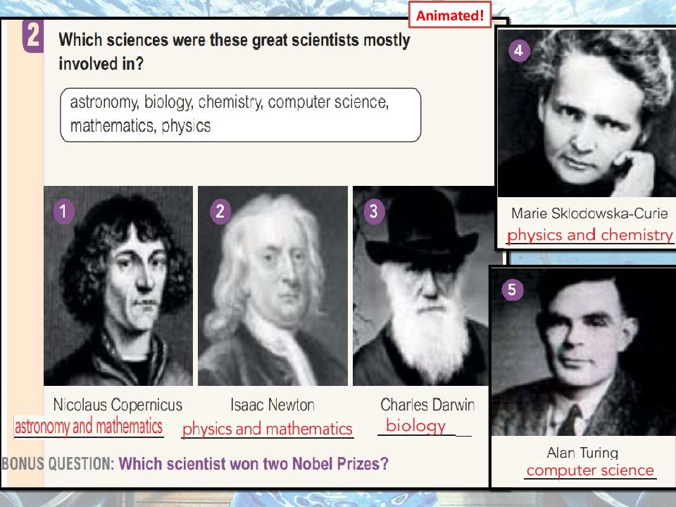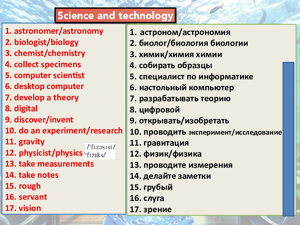 1. astronomer/astronomy 2. biologist/biology 3. chemist/chemistry 4. collect specimens 5. computer scientist 6. desktop computer 7. develop a theory 8. digital 9. discover/invent 10. do an experiment/research 11. gravity 12. physicist/physics 13. take measurements 14. take notes 15. rough 16. servant 17. vision астроном/астрономия 2. биолог/биология биологии 3. химик/химия химии 4. собирать образцы 5. специалист по информатике 6. настольный компьютер 7. разрабатывать теорию 8. цифровой 9. открывать/изобретать 10. проводить эксперимент/исследование 11. гравитация 12. физик/физика 13. проводите измерения 14. делайте заметки 15. грубый 16. слуга 17. зрение