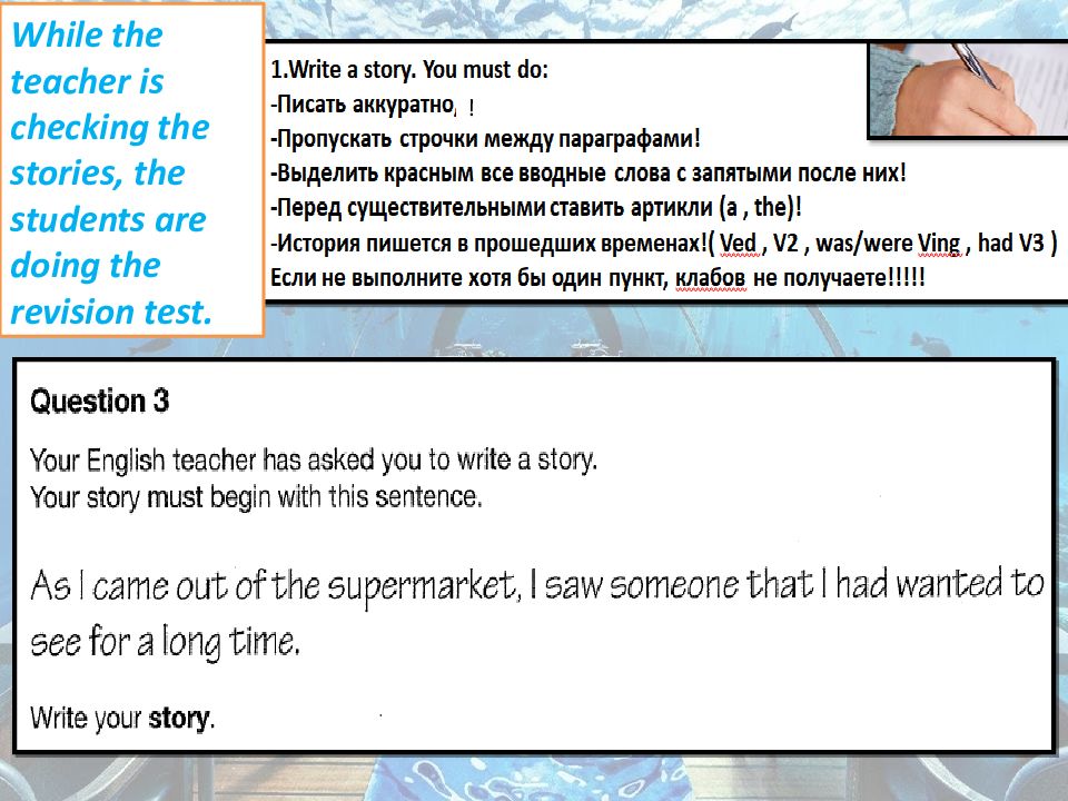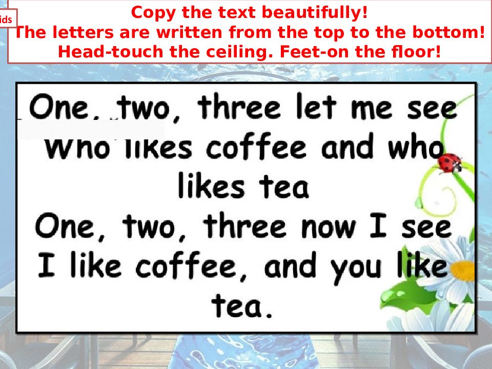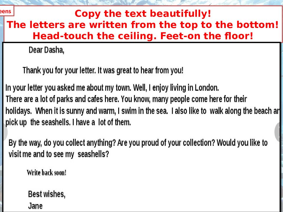 Copy the text beautifully! The letters are written from the top to the bottom! Head-touch the ceiling. Feet-on the floor! Teens