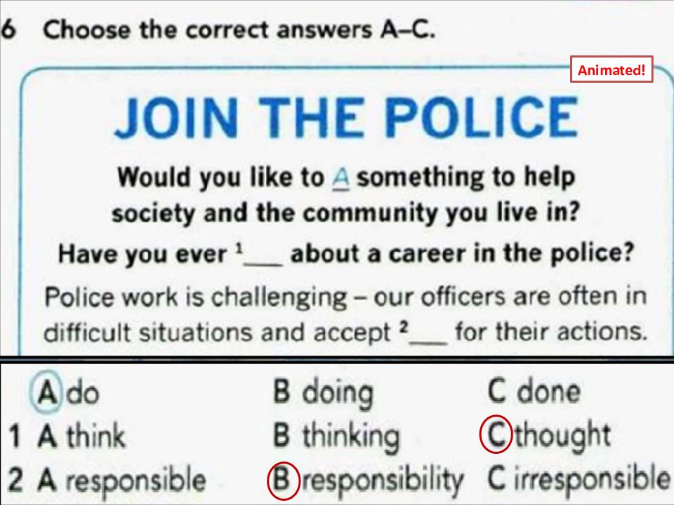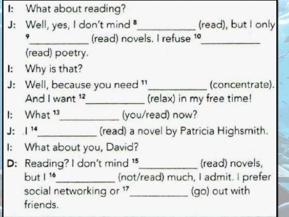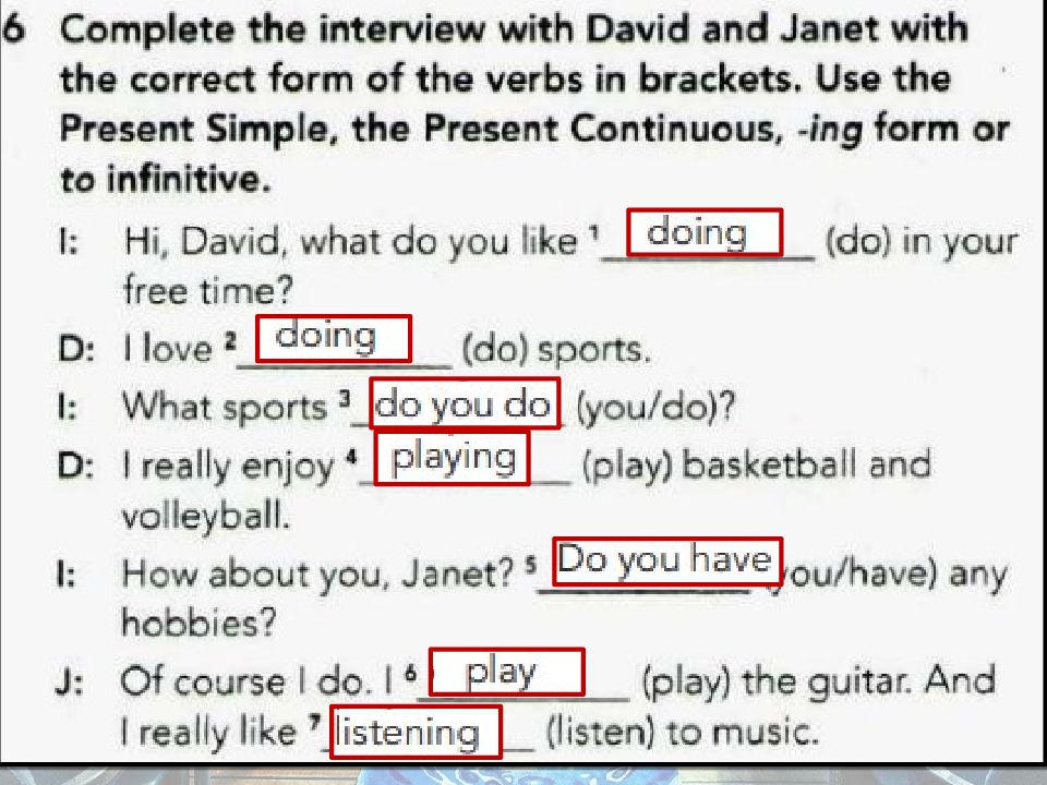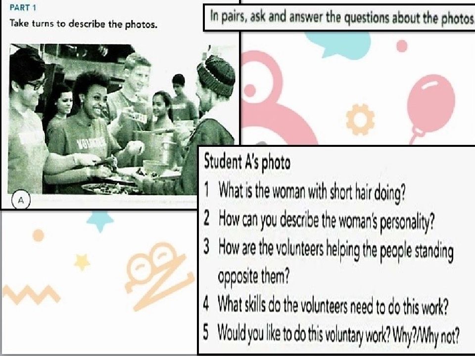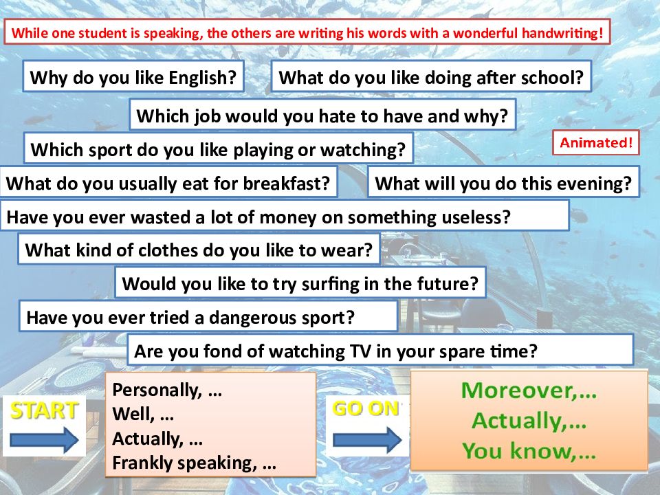 Why do you like English? Which job would you hate to have and why? What do you like doing after school? Which sport do you like playing or watching? What will you do this evening? Have you ever wasted a lot of money on something useless? Would you like to try surfing in the future? What kind of clothes do you like to wear? What do you usually eat for breakfast? Have you ever tried a dangerous sport? Are you fond of watching TV in your spare time? Personally, … Well, … Actually, … Frankly speaking, … While one student is speaking, the others are writing his words with a wonderful handwriting!