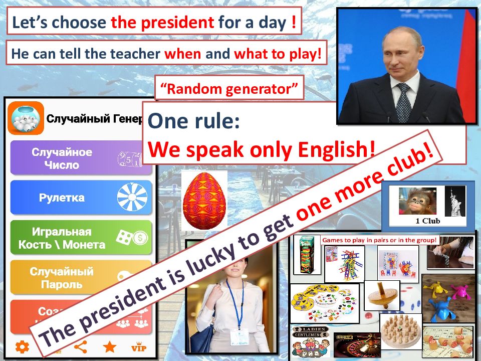Let’s choose the president for a day ! “Random generator” He can tell the teacher when and what to play! One rule: We speak only English! The president is lucky to get one more club!