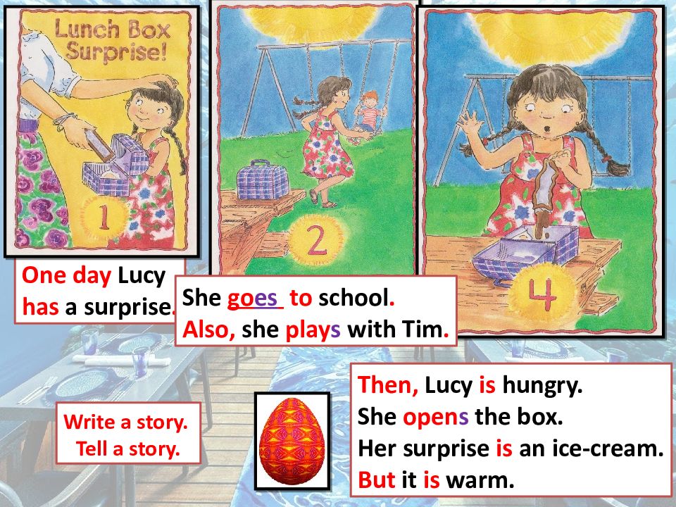 Write a story. Tell a story. One day Lucy has a surprise. Then, Lucy is hungry. She open s the box. Her surprise is an ice-cream. But it is warm. She go es to school. Also, she play s with Tim.