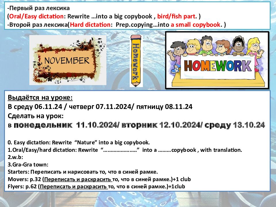 Выдаётся на уроке : В среду 06. 11.24 / четверг 07. 11.2024/ пятницу 08. 11.24 Сделать на урок: в понедельник 11. 10.202 4 / вторник 12. 10.202 4 / среду 13. 10.2 4 0. Easy dictation: Rewrite “Nature” into a big copybook. 1. Oral/Easy/hard dictation : Rewrite “ ………………….. ” into a ………copybook, with translation. 2. w.b : 3. Gra-Gra town: Starters: Переписать и нарисовать то, что в синей рамке. Movers: p.32 ( Переписать и раскрасить то, что в синей рамке. )+1 club Flyers: p. 62 ( Переписать и раскрасить то, что в синей рамке. )+1club - Первый раз лексика ( Oral/Easy dictation : Rewrite …into a big copybook, bird/fish part. ) -Второй раз лексика( Hard dictation : Prep.copying …into a small copybook. )