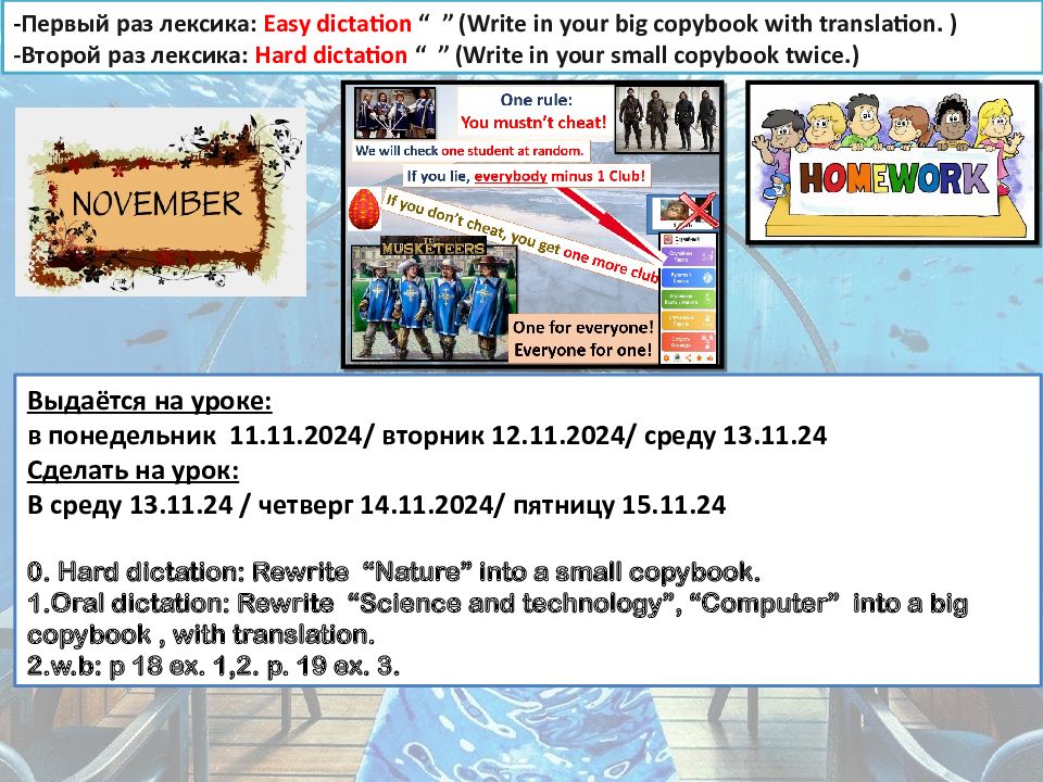 - Первый раз лексика : Easy dictation “ ” (Write in your big copybook with translation. ) -Второй раз лексика : Hard dictation “ ” (Write in your small copybook twice. ) Выдаётся на уроке : в понедельник 11.11.2024/ вторник 12.11.2024/ среду 13.11.24 Сделать на урок: В среду 13.1 1.24 / четверг 14.1 1.2024/ пятницу 15.11.24 0. Hard dictation: Rewrite “Nature” into a small copybook. 1.Oral dictation : Rewrite “Science and technology”, “Computer” into a big copybook, with translation. 2.w.b : p 18 ex. 1,2. p. 19 ex. 3.