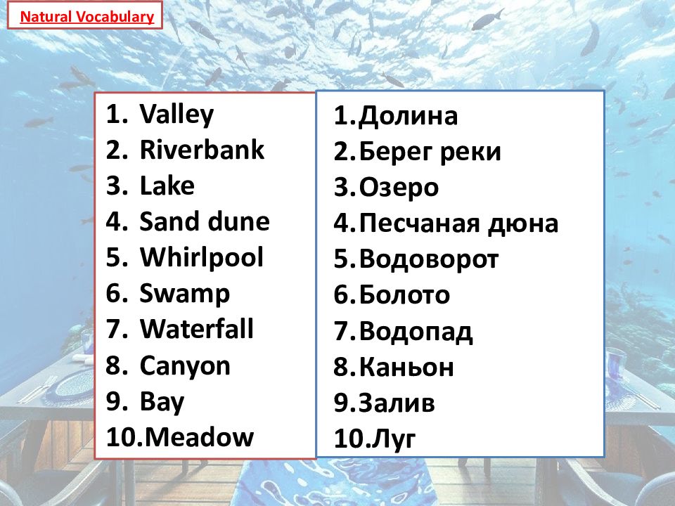 Valley Riverbank Lake Sand d une Whirlpool Swamp Waterfall Canyon Bay M eadow Natural Vocabulary Долина Берег реки Озеро Песчаная дюна Водоворот Болото Водопад Каньон Залив Луг