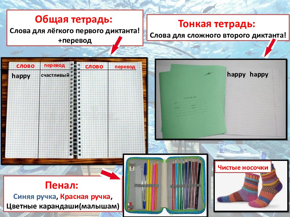 Общая тетрадь : Слова для лёгкого первого диктанта ! + перевод Тонкая тетрадь : Слова для сложного второго диктанта ! слово перевод слово перевод Пенал : Синяя ручка, Красная ручка, Цветные карандаши ( малышам ) Чистые носочки happy счастливый happy happy