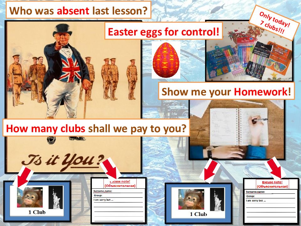 Who was absent last lesson? Only today! 7 clubs!!! Show me your Homework ! How many clubs shall we pay to you? Easter eggs for control!
