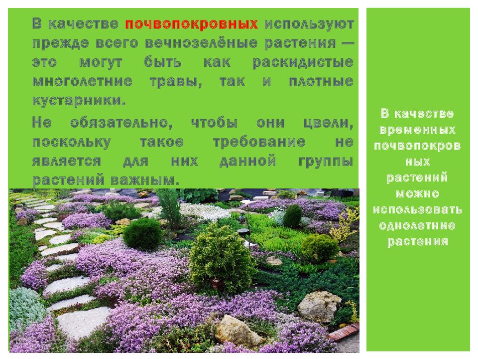В качестве временных почвопокровных растений можно использовать однолетние растения В качестве почвопокровных используют прежде всего вечнозелёные растения — это могут быть как раскидистые многолетние травы, так и плотные кустарники. Не обязательно, чтобы они цвели, поскольку такое требование не является для них данной группы растений важным.