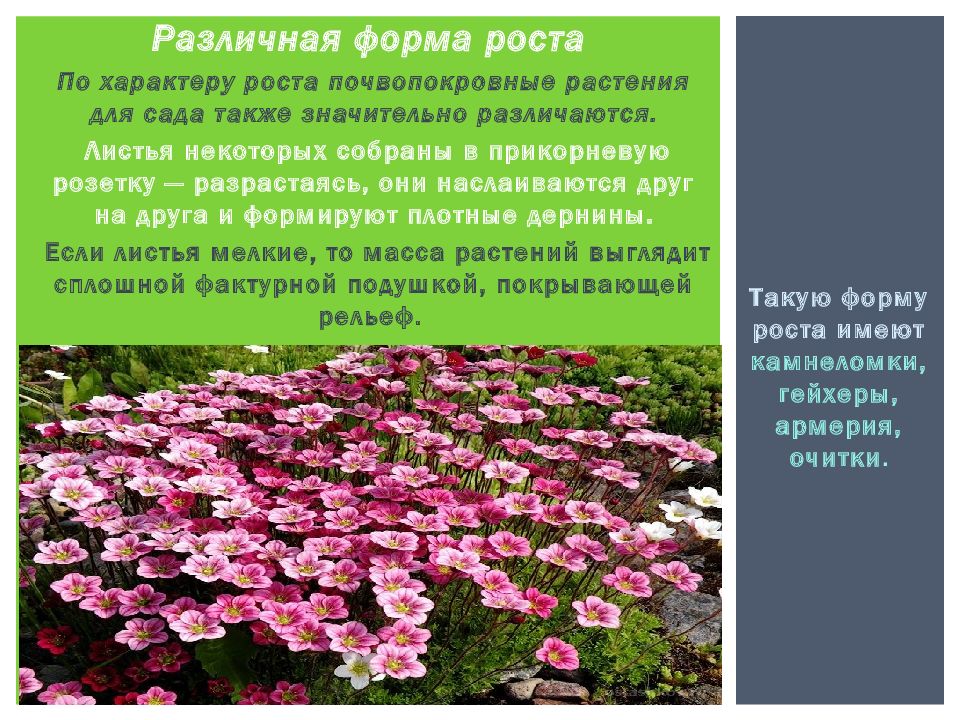 Такую форму роста имеют камнеломки, гейхеры, армерия, очитки. Различная форма роста По характеру роста почвопокровные растения для сада также значительно различаются. Листья некоторых собраны в прикорневую розетку — разрастаясь, они наслаиваются друг на друга и формируют плотные дернины. Если листья мелкие, то масса растений выглядит сплошной фактурной подушкой, покрывающей рельеф.