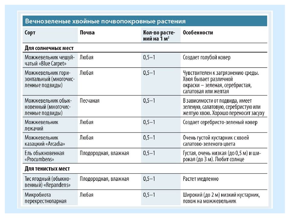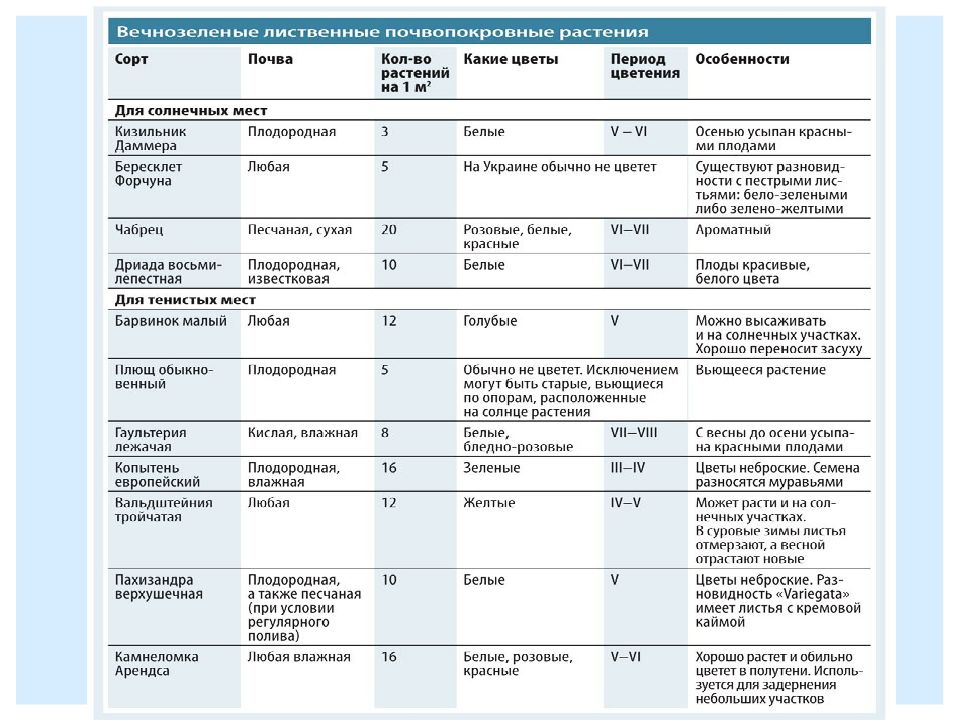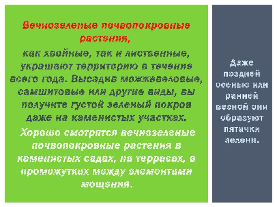 Даже поздней осенью или ранней весной они образуют пятачки зелени. Вечнозеленые почвопокровные растения, как хвойные, так и лиственные, украшают территорию в течение всего года. Высадив можжевеловые, самшитовые или другие виды, вы получите густой зеленый покров даже на каменистых участках. Хорошо смотрятся вечнозеленые почвопокровные растения в каменистых садах, на террасах, в промежутках между элементами мощения.