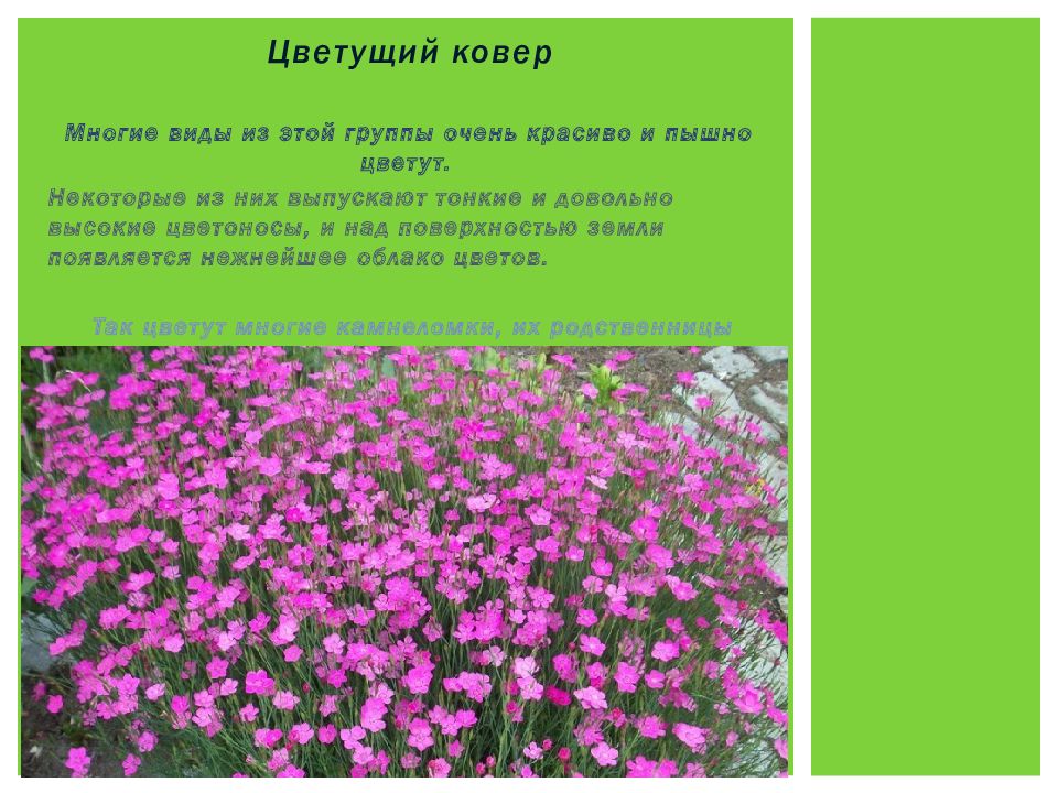 Цветущий ковер Многие виды из этой группы очень красиво и пышно цветут. Некоторые из них выпускают тонкие и довольно высокие цветоносы, и над поверхностью земли появляется нежнейшее облако цветов. Так цветут многие камнеломки, их родственницы гейхеры, арабис, гвоздика травянка.