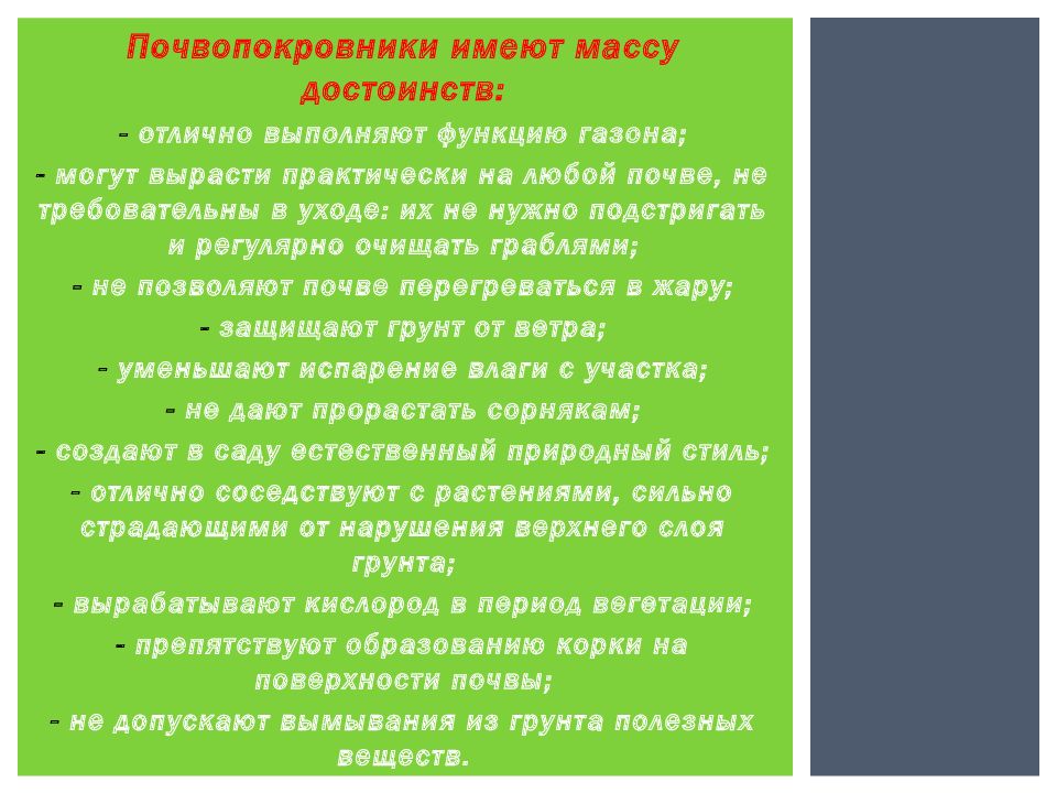 Почвопокровники имеют массу достоинств: - отлично выполняют функцию газона; - могут вырасти практически на любой почве, не требовательны в уходе: их не нужно подстригать и регулярно очищать граблями; - не позволяют почве перегреваться в жару; - защищают грунт от ветра; - уменьшают испарение влаги с участка; - не дают прорастать сорнякам; - создают в саду естественный природный стиль; - отлично соседствуют с растениями, сильно страдающими от нарушения верхнего слоя грунта; - вырабатывают кислород в период вегетации; - препятствуют образованию корки на поверхности почвы; - не допускают вымывания из грунта полезных веществ.