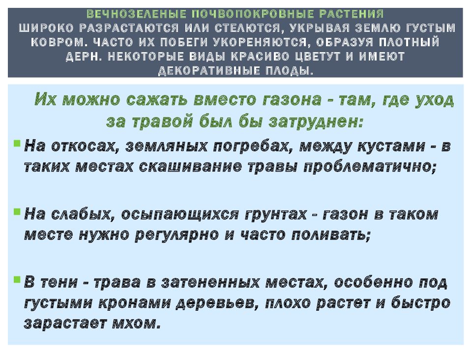 Их можно сажать вместо газона - там, где уход за травой был бы затруднен : Н а откосах, земляных погребах, между кустами - в таких местах скашивание травы проблематично ; На слабых, осыпающихся грунтах - газон в таком месте нужно регулярно и часто поливать ; В тени - трава в затененных местах, особенно под густыми кронами деревьев, плохо растет и быстро зарастает мхом.