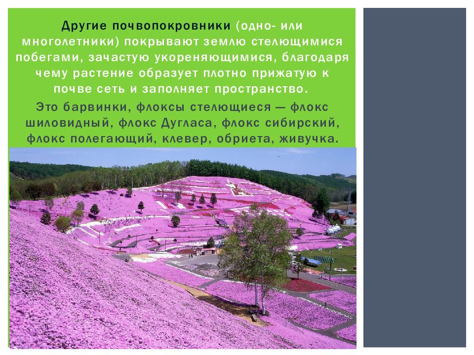 Другие почвопокровники (одно- или многолетники) покрывают землю стелющимися побегами, зачастую укореняющимися, благодаря чему растение образует плотно прижатую к почве сеть и заполняет пространство. Это барвинки, флоксы стелющиеся — флокс шиловидный, флокс Дугласа, флокс сибирский, флокс полегающий, клевер, обриета, живучка.