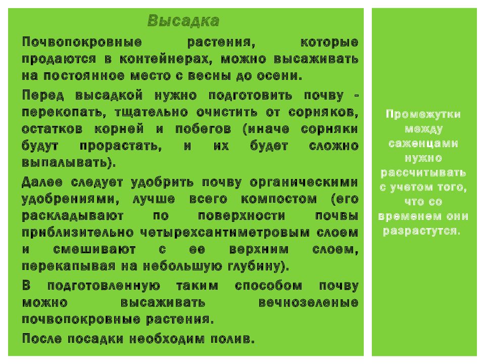 Промежутки между саженцами нужно рассчитывать с учетом того, что со временем они разрастутся. Высадка Почвопокровные растения, которые продаются в контейнерах, можно высаживать на постоянное место с весны до осени. Перед высадкой нужно подготовить почву - перекопать, тщательно очистить от сорняков, остатков корней и побегов (иначе сорняки будут прорастать, и их будет сложно выпалывать). Далее следует удобрить почву органическими удобрениями, лучше всего компостом (его раскладывают по поверхности почвы приблизительно четырехсантиметровым слоем и смешивают с ее верхним слоем, перекапывая на небольшую глубину). В подготовленную таким способом почву можно высаживать вечнозеленые почвопокровные растения. После посадки необходим полив.
