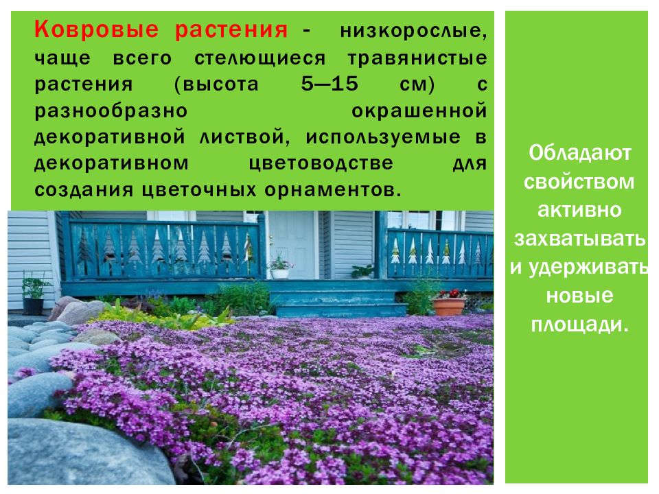 Ковровые растения - низкорослые, чаще всего стелющиеся травянистые растения (высота 5—15 см) с разнообразно окрашенной декоративной листвой, используемые в декоративном цветоводстве для создания цветочных орнаментов. Обладают свойством активно захватывать и удерживать новые площади.