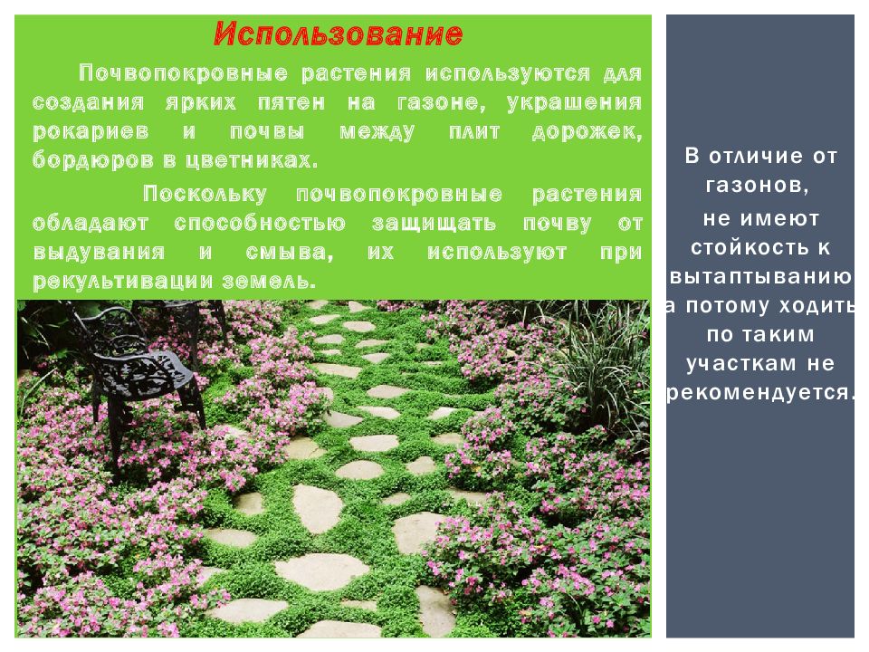 Использование Почвопокровные растения используются для создания ярких пятен на газоне, украшения рокариев и почвы между плит дорожек, бордюров в цветниках. Поскольку почвопокровные растения обладают способностью защищать почву от выдувания и смыва, их используют при рекультивации земель. В отличие от газонов, не имеют стойкость к вытаптываниюа потому ходить по таким участкам не рекомендуется.